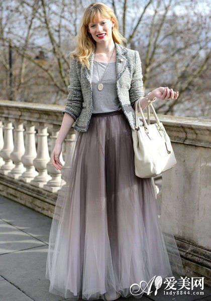 欧美街拍短外套+长裙搭配一 小编心得:短外套很有CHANEL的范儿,素雅高贵,搭配茶色渐变蓬蓬轻纱长裙,真的太美了!兼有少女的浪漫,又有都市名媛感。